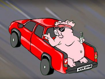 A massive hunk of pork romps through the barren wasteland of an interstate, as an old pickup truck struggles to carry his weight toward his eventual grave.